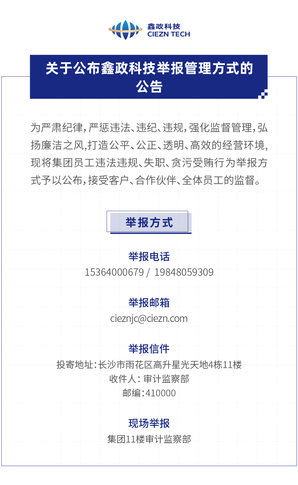 關(guān)于公布鑫政科技舉報管理方式的公告